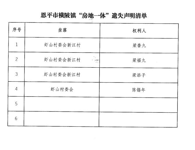恩平市橫陂鎮(zhèn)“房地一體”遺失聲明清單