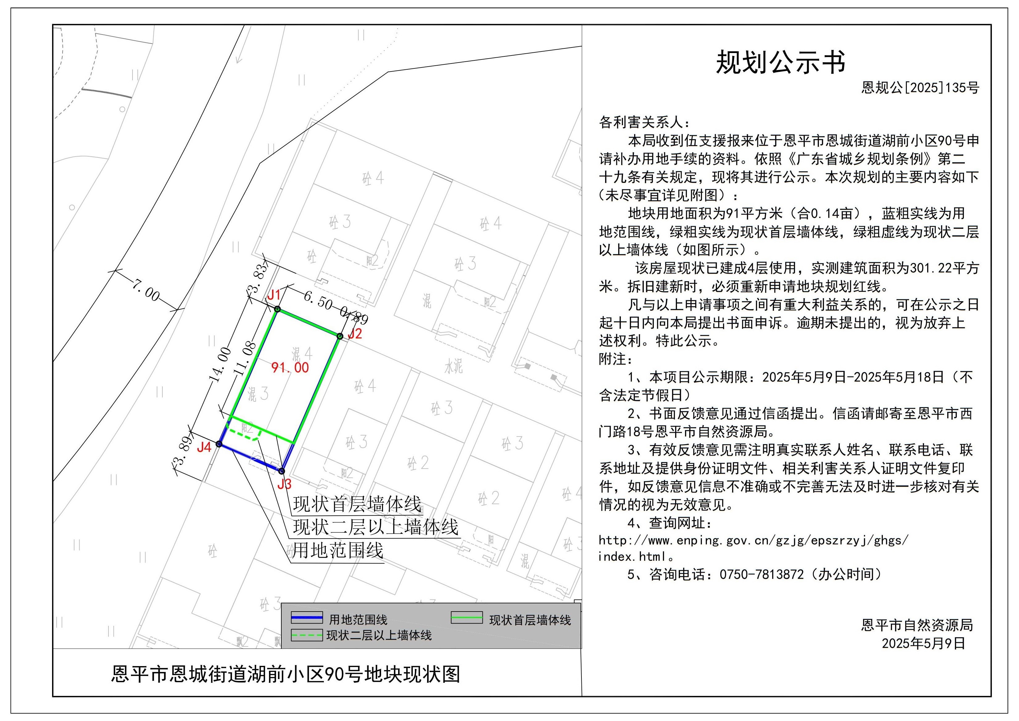 恩規(guī)公[2025]135號(hào) 規(guī)劃公示書 關(guān)于恩平市恩城街道湖前小區(qū)90號(hào)(伍支援)的地塊現(xiàn)狀圖公示