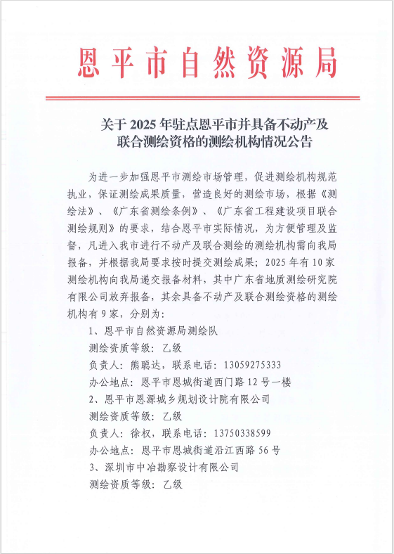 關于2025年駐點恩平市并具備不動產(chǎn)及聯(lián)合測繪資格的測繪機構情況公告(3).png