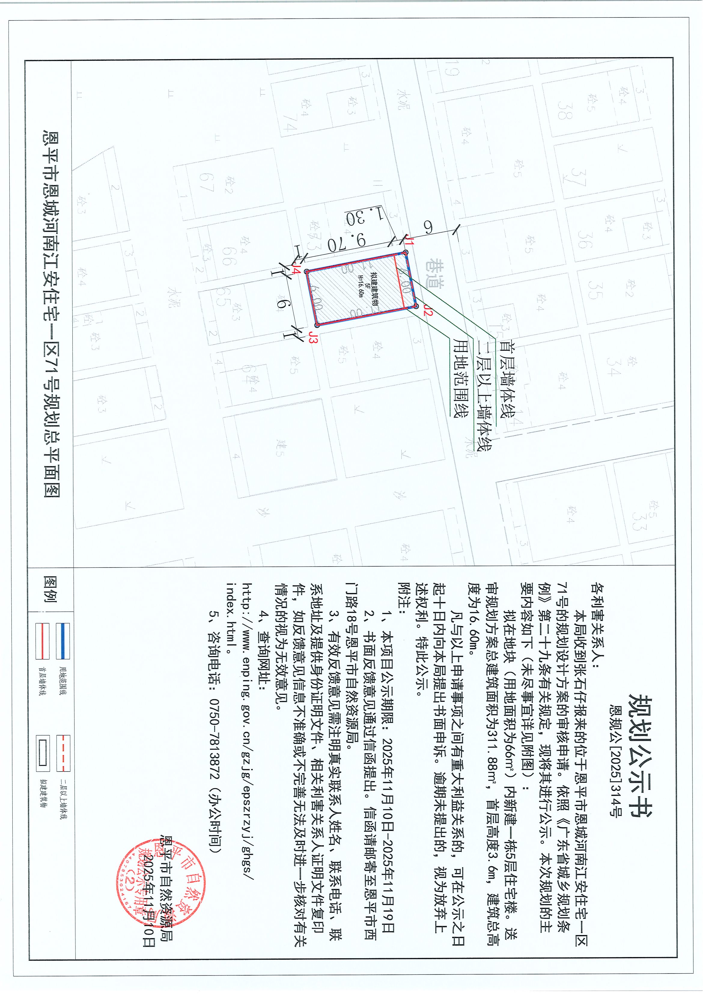恩規(guī)公[2025]314號 關(guān)于恩平市恩城河南江安住宅一區(qū)71號(張石仔)的規(guī)劃公示書