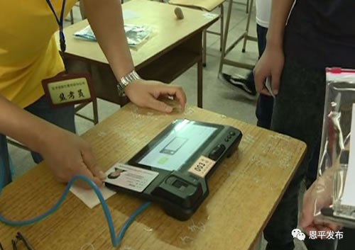 八點(diǎn)半,考生陸續(xù)進(jìn)入考場。按照規(guī)定,每個(gè)考生在進(jìn)入考場前,都需要接受金屬探測儀的檢查,并在監(jiān)考老師的指導(dǎo)下,拿出身份證,在考點(diǎn)設(shè)置的身份識別儀上進(jìn)行身份以及指紋等多重驗(yàn)證。工作人員還提醒考生不能攜帶各種無線通訊工具以及任何帶有文字標(biāo)簽的飲用水、水杯等物品進(jìn)入考場。