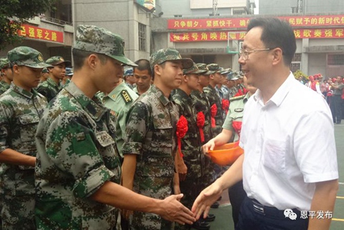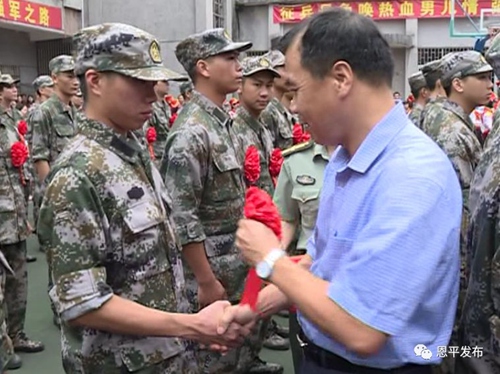 劉兵在儀式上表示,適齡青年應(yīng)征入伍、參軍保家衛(wèi)國是國家法律賦予的神圣職責(zé)和光榮義務(wù)。恩平市青年踴躍報名參軍,立志保衛(wèi)祖國,市政府和家鄉(xiāng)人民為此感到驕傲和自豪。他希望新兵們到達(dá)部隊后,要尊重領(lǐng)導(dǎo)、團(tuán)結(jié)戰(zhàn)友、刻苦訓(xùn)練、遵章守紀(jì),在艱苦環(huán)境中磨練自己,努力把自己培養(yǎng)成為政治合格、軍事過硬、紀(jì)律嚴(yán)明、作風(fēng)優(yōu)良的優(yōu)秀軍人,多爭榮譽、多立新功,為國防建設(shè)效力,為家鄉(xiāng)人民爭光。
