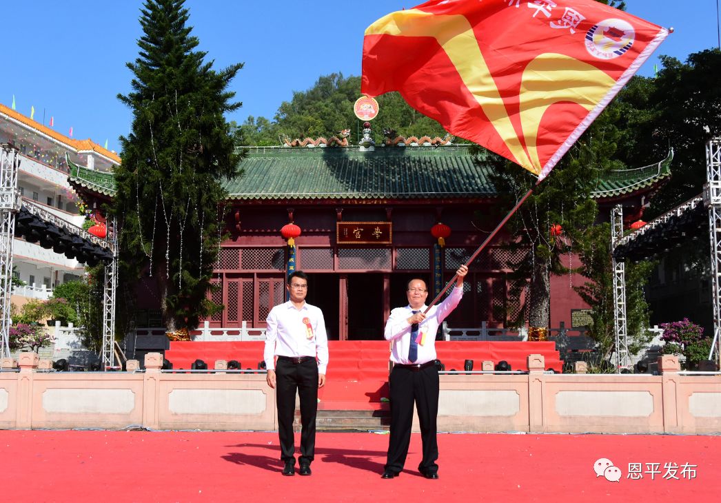 授旗儀式上,市教育局局長莫平福(左)授旗,恩平一中校長陳健國(右)接旗