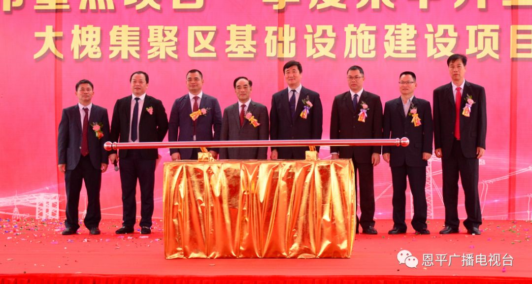 江門市政協(xié)副主席費(fèi)偉東,恩平市委書記謝超武,江門市發(fā)展和改革局副局長(zhǎng)姚益平,恩平市領(lǐng)導(dǎo)禤纘靈、鄭成博、岑仲平、岑安林出席大槐集聚區(qū)基礎(chǔ)設(shè)施建設(shè)項(xiàng)目開工儀式。