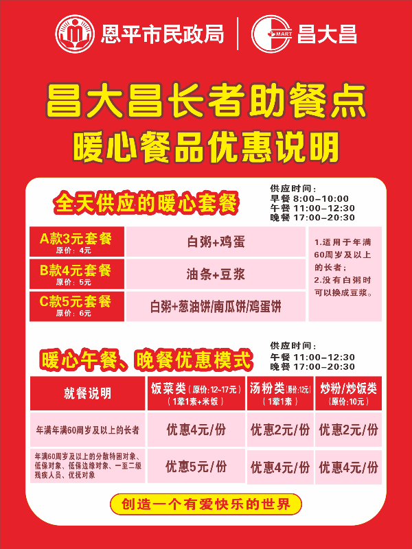 恩平市樂·食堂昌大昌長者助餐點設在昌大昌超市熟食休閑區(qū),面積約60平方米,設置餐位30個。助餐點推出了6款優(yōu)惠套餐,包括3款全天供應的“暖心套餐”,原價4—6元,長者均可優(yōu)惠1元;3款專供午餐和晚餐的優(yōu)惠套餐,長者購買飯菜類可優(yōu)惠4元/份,湯粉類或炒粉/炒飯類可優(yōu)惠2元/份。特殊困難長者或優(yōu)撫對象的優(yōu)惠力度更大。
