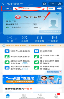 第一步:打開微信“電子社??ā毙〕绦虿⒌卿?,左上角地區(qū)選擇“江門市”——在搜索框輸入【養(yǎng)老保險(xiǎn)關(guān)系轉(zhuǎn)移】并點(diǎn)擊【搜索】——在【我要申請(qǐng)】模塊選擇【機(jī)關(guān)事業(yè)單位養(yǎng)老保險(xiǎn)與企業(yè)職工基本養(yǎng)老保險(xiǎn)互轉(zhuǎn)】。