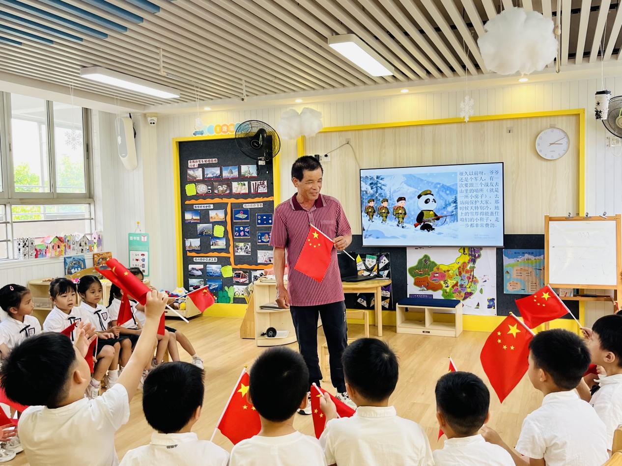 梁凱旋為在座的每位小朋友帶來了一面手搖小五星紅旗,引導(dǎo)小朋友輕輕搖動手中的五星紅旗,跟紅旗打招呼。隨后,他以五星紅旗的象征和意義為切入,用通俗易懂的語言、鮮活生動的事例,將自己四年多的軍旅生涯中,每天與戰(zhàn)友們起早貪黑,刻苦練習(xí)本領(lǐng)的經(jīng)歷娓娓道來。他教育小朋友們要努力學(xué)習(xí),堅強勇敢,成長為有理想有擔(dān)當?shù)男」?。孩子們認真聆聽、不時舉手積極踴躍地提問,現(xiàn)場互動氛圍熱烈。