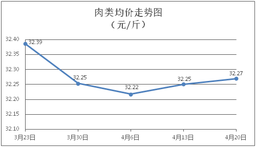 肉類商品價格窄幅盤整。所監(jiān)測的8種肉類商品價格波動情況為3漲4跌1平,綜合零售均價為每斤32.27元,環(huán)比上漲0.06%。其中:排骨、精瘦肉、牛肉、帶骨羊肉零售均價分別為每斤31.06元、19.19元、46.11元、42.31元,環(huán)比分別下降0.22%、下降0.67%、上漲0.02%、上漲0.93%。