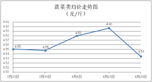 據(jù)本市21家農(nóng)貿(mào)市場監(jiān)測數(shù)據(jù)顯示,上周(4月14日至4月20日)市場上各類“菜籃子”商品供應(yīng)充足,所監(jiān)測的7大類“菜籃子”商品價格環(huán)比總體表現(xiàn)為3漲4跌。其中:糧油類商品價格總體略降,肉類、水果類、水產(chǎn)類商品價格窄幅盤整,禽蛋類、蔬菜類商品價格以降為主。