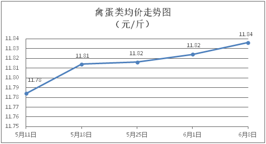 禽蛋類商品價(jià)格小幅波動。所監(jiān)測的5種禽蛋類商品價(jià)格波動情況為1漲2跌2平,綜合零售均價(jià)為每斤11.84元,環(huán)比上漲0.10%。其中:白條雞、白條鴨零售均價(jià)分別為每斤20.74元、15.39元,環(huán)比分別下降0.05%、上漲0.52%;雞蛋、鴨蛋零售均價(jià)分別為每斤6.63元、7.20元,環(huán)比分別下降0.15%、持平。