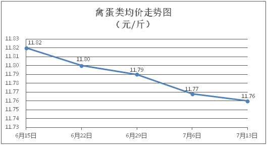 禽蛋類商品價格窄幅盤降。所監(jiān)測的5種禽蛋類商品價格波動情況為1漲2跌2平,綜合零售均價為每斤11.76元,環(huán)比下降0.07%。其中:白條雞、白條鴨零售均價分別為每斤20.58元、15.42元,環(huán)比分別上漲0.15%、持平;雞蛋、鴨蛋零售均價分別為每斤6.53元、7.11元,環(huán)比分別下降0.76%、持平。