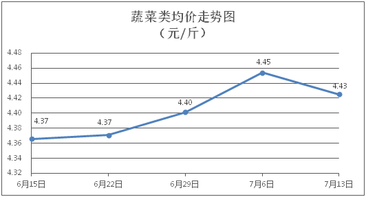 蔬菜類商品價格以降為主。所監(jiān)測的32 種蔬菜商品價格波動情況為9漲19跌4平,綜合零售均價為每斤4.43元,環(huán)比下降0.64%。其中:漲幅居前的品種包括萵筍、芥蘭、水東芥菜,零售均價分別為每斤3.79元、5.18元、3.96元,環(huán)比分別上漲4.70%、2.78%、2.06%;跌幅靠前的品種包括絲瓜、青豆角、青皮冬瓜,零售均價分別為每斤4.57元、4.99元、2.50元,環(huán)比分別下降5.58%、3.48%、2.72%。