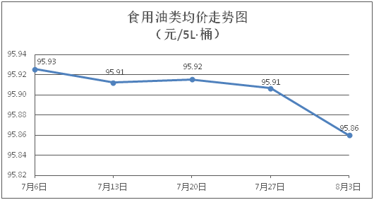 食用油類商品價格穩(wěn)中微降。所監(jiān)測的9種食用油(5L裝)商品價格波動情況為2跌7平,綜合零售均價為每桶95.86元,環(huán)比下降0.05%。其中:金龍魚花生油、金龍魚調(diào)和油零售均價為每桶102.83元、70.89元,環(huán)比分別持平、下降0.49%。