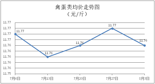禽蛋類商品價格小幅波動。所監(jiān)測的5種禽蛋類商品價格波動情況為2漲1跌2平,綜合零售均價為每斤11.76元,環(huán)比下降0.05%。其中:白條雞、白條鴨零售均價分別為每斤20.66元、15.42元,環(huán)比分別下降0.24%、上漲0.06%;雞蛋、鴨蛋零售均價分別為每斤6.53元、7.07元,環(huán)比分別上漲0.15%、持平。