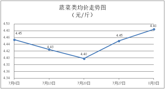 蔬菜類商品價格以漲為主。所監(jiān)測的32 種蔬菜商品價格波動情況為20漲9跌3平,綜合零售均價為每斤4.48元,環(huán)比上漲0.77%。其中:漲幅居前的品種包括絲瓜、韭菜、上海青,零售均價分別為每斤4.83元、4.79元、3.81元,環(huán)比分別上漲5.46%、4.13%、3.53%;跌幅靠前的品種包括生菜、紅蘿卜、菠菜,零售均價分別為每斤3.92元、2.95元、6.00元,環(huán)比分別下降1.75%、1.67%、1.48%。