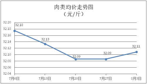 肉類商品價格微幅上漲。所監(jiān)測的8種肉類商品價格波動情況為5漲3平,綜合零售均價為每斤32.11元,環(huán)比上漲0.07%。其中:排骨、精瘦肉、牛肉、帶骨羊肉零售均價分別為每斤30.22元、18.92元、46.54元、42.11元,環(huán)比分別上漲0.23%、上漲0.05%、上漲0.09%、上漲0.05%。