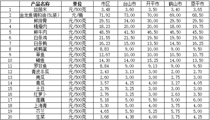 說明:1、表中價格為該地區(qū)監(jiān)測點上周綜合平均價;2、“市區(qū)”含蓬江區(qū)、江海區(qū)、新會區(qū),價格分別采自蓬江市場、江南市場、城東市場等13家農(nóng)貿(mào)市場;3、其他四個縣市價格分別采自新華市場、錦江市場等8家農(nóng)貿(mào)市場。