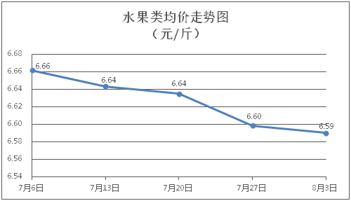 水果類商品價格持續(xù)走弱。所監(jiān)測的6種水果商品價格波動情況為1漲3跌2平,綜合零售均價為每斤6.59元,環(huán)比下降0.13%。其中橙子、香蕉、葡萄零售均價分別為每斤6.68元、3.34元、13.60元,環(huán)比分別上漲2.14%、下降0.89%、下降1.09%。
