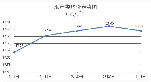水產(chǎn)類商品價格窄幅盤整。所監(jiān)測的9種水產(chǎn)商品價格波動情況為2漲2跌4平,綜合均價為每斤17.60元,環(huán)比下降0.04%。其中:草魚、鳙魚、羅非魚、基圍蝦零售均價分別為每斤11.32元、10.76元、9.02元、30.80元,環(huán)比分別持平、上漲0.09%、下降0.22%、持平。