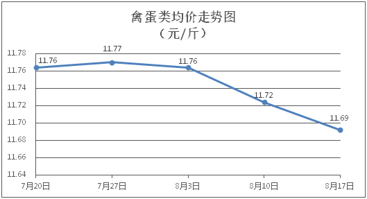禽蛋類商品價格微幅下降。所監(jiān)測的5種禽蛋類商品價格波動情況為3跌2平,綜合零售均價為每斤11.69元,環(huán)比下降0.27%。其中:白條雞、白條鴨零售均價分別為每斤20.69元、15.21元,環(huán)比分別下降0.39%、持平;雞蛋、鴨蛋零售均價分別為每斤6.37元、7.08元,環(huán)比分別下降0.78%、持平。