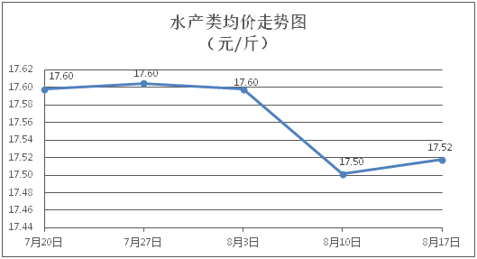 水產(chǎn)類商品價格總體略漲。所監(jiān)測的9種水產(chǎn)商品價格波動情況為4漲3跌2平,綜合均價為每斤17.52元,環(huán)比上漲0.10%。其中:草魚、鳙魚、鱸魚、基圍蝦零售均價分別為每斤11.32元、10.33元、23.46元、29.49元,環(huán)比分別持平、上漲0.37%、上漲1.43%、下降1.01%。