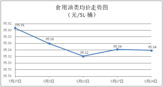 食用油類商品價(jià)格基本平穩(wěn)。所監(jiān)測的9種食用油(5L裝)商品價(jià)格波動(dòng)情況為1跌8平,綜合零售均價(jià)為每桶95.84元,環(huán)比下降0.003%。其中:金龍魚花生油、大豆油零售均價(jià)分別為每桶102.62元、61.58元,環(huán)比分別持平、下降0.05%。