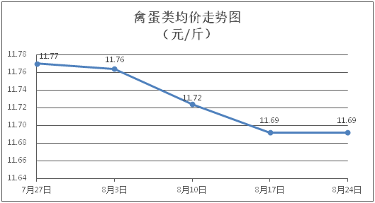 禽蛋類商品價(jià)格窄幅波動(dòng)。所監(jiān)測的5種禽蛋類商品價(jià)格波動(dòng)情況為3漲2跌,綜合零售均價(jià)為每斤11.69元,環(huán)比持平。其中:白條雞、白條鴨零售均價(jià)分別為每斤20.79元、15.22元,環(huán)比分別上漲0.48%、上漲0.07%;雞蛋、鴨蛋零售均價(jià)分別為每斤6.31元、7.10元,環(huán)比分別下降0.94%、上漲0.28%。