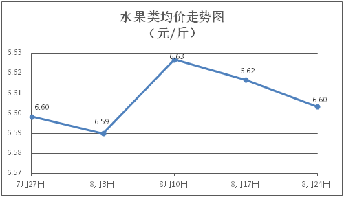 水果類商品價(jià)格漲少跌多。所監(jiān)測的6種水果商品價(jià)格波動(dòng)情況為2漲3跌1平,綜合零售均價(jià)為每斤6.60元,環(huán)比下降0.20%。其中橙子、香蕉、葡萄零售均價(jià)分別為每斤7.01元、3.20元、13.34元,環(huán)比分別上漲2.19%、下降1.54%、下降1.48%。