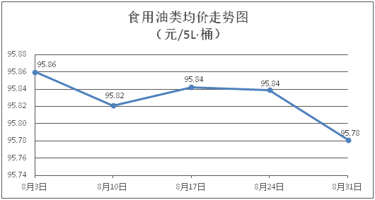 食用油類商品價(jià)格穩(wěn)中微跌。所監(jiān)測(cè)的9種食用油(5L裝)商品價(jià)格波動(dòng)情況為4跌5平,綜合零售均價(jià)為每桶95.78元,環(huán)比下降0.06%。其中:金龍魚(yú)花生油、大豆油零售均價(jià)分別為每桶102.38元、61.50元,環(huán)比分別下降0.23%、下降0.13%。