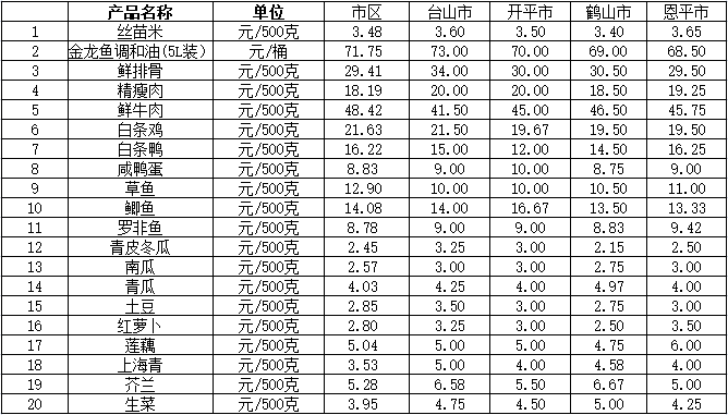 說(shuō)明:1、表中價(jià)格為該地區(qū)監(jiān)測(cè)點(diǎn)上周綜合平均價(jià);2、“市區(qū)”含蓬江區(qū)、江海區(qū)、新會(huì)區(qū),價(jià)格分別采自蓬江市場(chǎng)、江南市場(chǎng)、城東市場(chǎng)等13家農(nóng)貿(mào)市場(chǎng);3、其他四個(gè)縣市價(jià)格分別采自新華市場(chǎng)、錦江市場(chǎng)等8家農(nóng)貿(mào)市場(chǎng)。