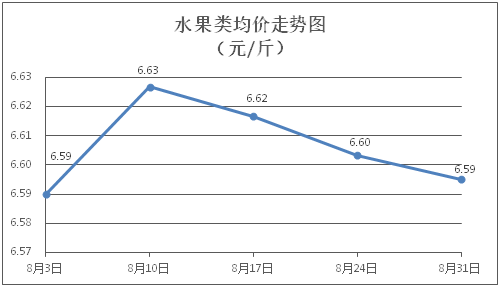 水果類商品價(jià)格微幅波動(dòng)。所監(jiān)測(cè)的6種水果商品價(jià)格波動(dòng)情況為2漲1跌3平,綜合零售均價(jià)為每斤6.60元,環(huán)比下降0.13%。其中橙子、香蕉、葡萄零售均價(jià)分別為每斤7.03元、3.20元、13.25元,環(huán)比分別上漲0.29%、持平、下降0.67%。