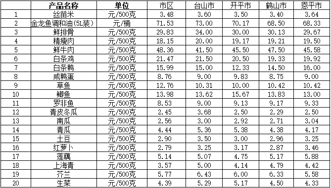 說明:1、表中價(jià)格為該地區(qū)監(jiān)測(cè)點(diǎn)上周綜合平均價(jià);2、“市區(qū)”含蓬江區(qū)、江海區(qū)、新會(huì)區(qū),價(jià)格分別采自蓬江市場(chǎng)、江南市場(chǎng)、城東市場(chǎng)等13家農(nóng)貿(mào)市場(chǎng);3、其他四個(gè)縣市價(jià)格分別采自新華市場(chǎng)、錦江市場(chǎng)等8家農(nóng)貿(mào)市場(chǎng)。