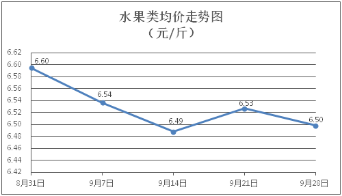 水果類商品價(jià)格升降互現(xiàn)。所監(jiān)測(cè)的6種水果商品價(jià)格波動(dòng)情況為3漲3跌,綜合零售均價(jià)為每斤6.50元,環(huán)比下降0.43%。其中橙子、香蕉、梨零售均價(jià)分別為每斤7.53元、2.95元、5.32元,環(huán)比分別上漲2.03%、下降1.99%、上漲0.19%。