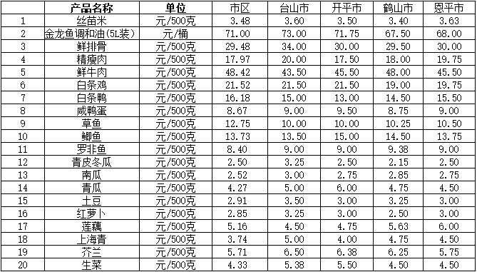 說明:1、表中價格為該地區(qū)監(jiān)測點上周綜合平均價;2、“市區(qū)”含蓬江區(qū)、江海區(qū)、新會區(qū),價格分別采自蓬江市場、江南市場、城東市場等13家農(nóng)貿(mào)市場;3、其他四個縣市價格分別采自新華市場、錦江市場等8家農(nóng)貿(mào)市場。