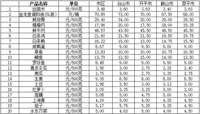 說明:1、表中價(jià)格為該地區(qū)監(jiān)測點(diǎn)上周綜合平均價(jià);2、“市區(qū)”含蓬江區(qū)、江海區(qū)、新會區(qū),價(jià)格分別采自蓬江市場、江南市場、城東市場等13家農(nóng)貿(mào)市場;3、其他四個(gè)縣市價(jià)格分別采自新華市場、錦江市場等8家農(nóng)貿(mào)市場。