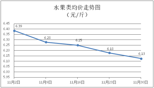 水果類商品價(jià)格總體略降。所監(jiān)測的水果商品價(jià)格波動情況為2漲3跌1平,綜合零售均價(jià)為每斤6.13元,環(huán)比下降0.84%。其中橙子、蘋果、葡萄零售均價(jià)分別為每斤6.28元、7.97元、11.43元,環(huán)比分別下降3.24%、上漲0.25%、下降0.44%。
