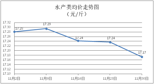 水產(chǎn)類商品價(jià)格有所下降。所監(jiān)測的水產(chǎn)商品價(jià)格波動情況為1漲5跌3平,綜合均價(jià)為每斤17.17元,環(huán)比下降0.37%。其中:草魚、鯽魚、羅非魚、基圍蝦零售均價(jià)分別為每斤11.39元、13.63元、8.85元、28.29元,環(huán)比分別持平、下降0.87%、下降0.34%、下降0.14%。