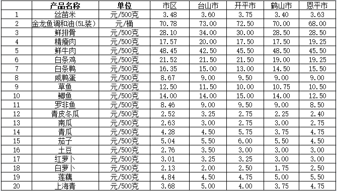 說明:1、表中價格為該地區(qū)監(jiān)測點上周綜合平均價;2、“市區(qū)”含蓬江區(qū)、江海區(qū)、新會區(qū),價格分別采自蓬江市場、江南市場、城東市場等13家農(nóng)貿(mào)市場;3、其他四個縣市價格分別采自新華市場、錦江市場等8家農(nóng)貿(mào)市場。