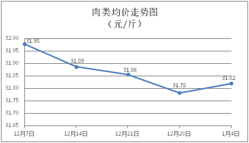 肉類商品價格窄幅盤整。所監(jiān)測的肉類商品價格波動情況為3漲4跌1平,綜合零售均價為每斤31.82元,環(huán)比上漲0.12%。其中:排骨、精瘦肉、牛肉、帶骨羊肉零售均價分別為每斤29.33元、18.14元、46.76元、41.44元,環(huán)比分別下降0.07%、下降0.33%、上漲0.21%、上漲0.19%。