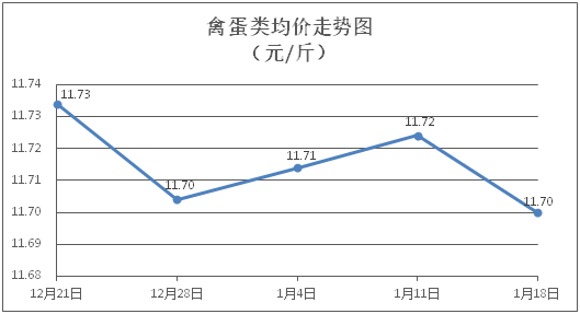 禽蛋類商品價格總體略降。所監(jiān)測的禽蛋類商品價格波動情況為2漲3跌,綜合零售均價為每斤11.70元,環(huán)比下降0.20%。其中:白條雞、白條鴨零售均價分別為每斤20.90元、15.28元,環(huán)比分別上漲0.10%、下降0.07%;雞蛋、咸鴨蛋零售均價分別為每斤6.35元、8.88元,環(huán)比分別上漲0.32%、下降0.56%。