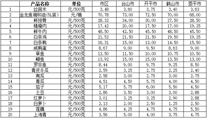 說明:1、表中價格為該地區(qū)監(jiān)測點上周綜合平均價;2、“市區(qū)”含蓬江區(qū)、江海區(qū)、新會區(qū),價格分別采自蓬江市場、江南市場、城東市場等13家農(nóng)貿(mào)市場;3、其他四個縣市價格分別采自新華市場、錦江市場等8家農(nóng)貿(mào)市場。