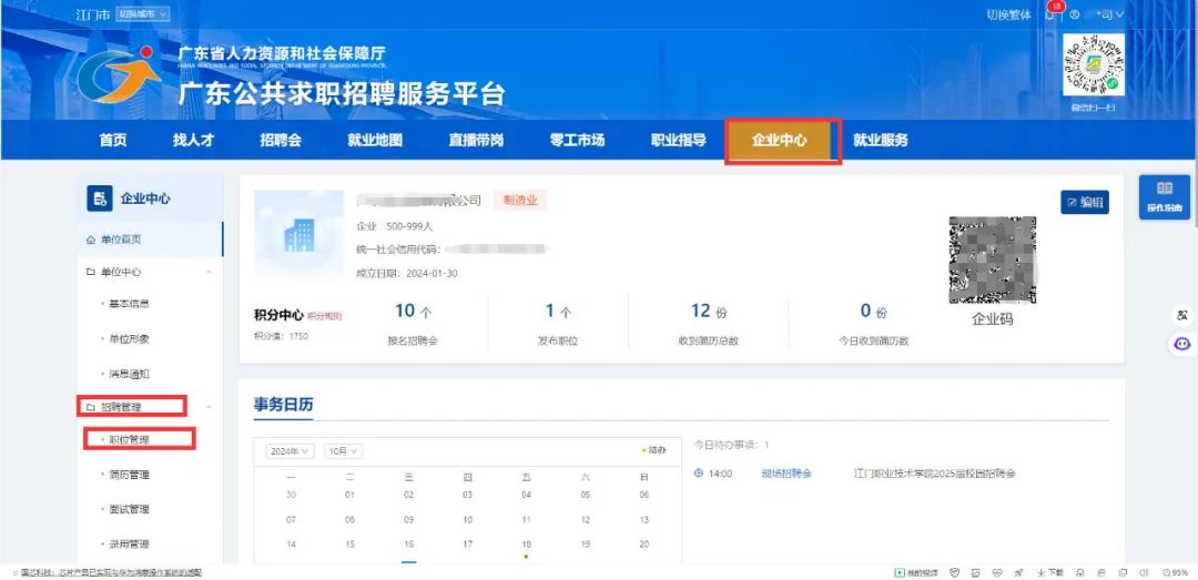 廣東公共求職招聘服務平臺→企業(yè)中心→招聘管理→職位管理