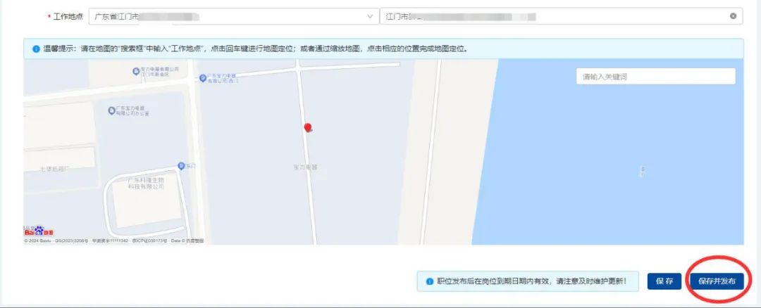 2、完善招聘職位信息,帶*號的為必填項??牲c擊【保存】按鈕保存職位信息,也可點擊【保存并發(fā)布】將該職位信息提交到人社部門進行審核。