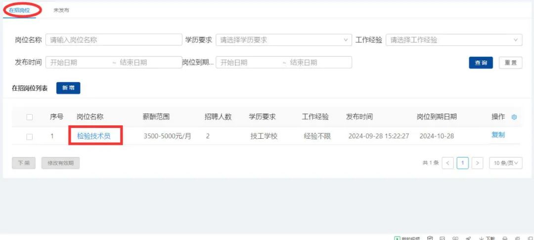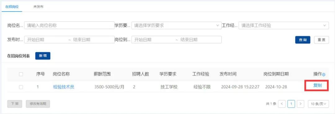4、復制職位:點擊崗位列表的【復制】按鈕,復制當前職位。復制成功后的職位,在【未發(fā)布】列表顯示,可對該職位進行修改、發(fā)布等操作。