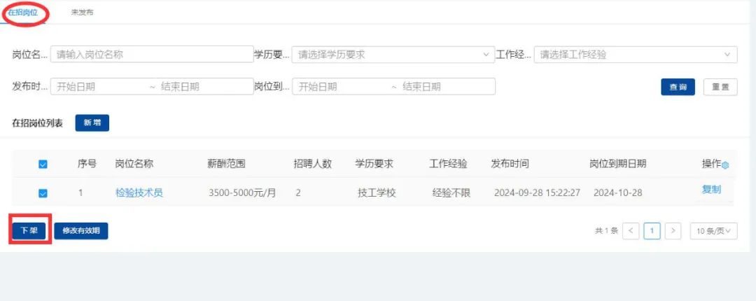 5、下架職位:只能對已發(fā)布的職位進行該操作。在【在招崗位】列表頁,勾選單條或多條職位,點擊【下架】按鈕,即可下架職位。下架的職位,求職者在公共就業(yè)平臺無法搜索到該職位。