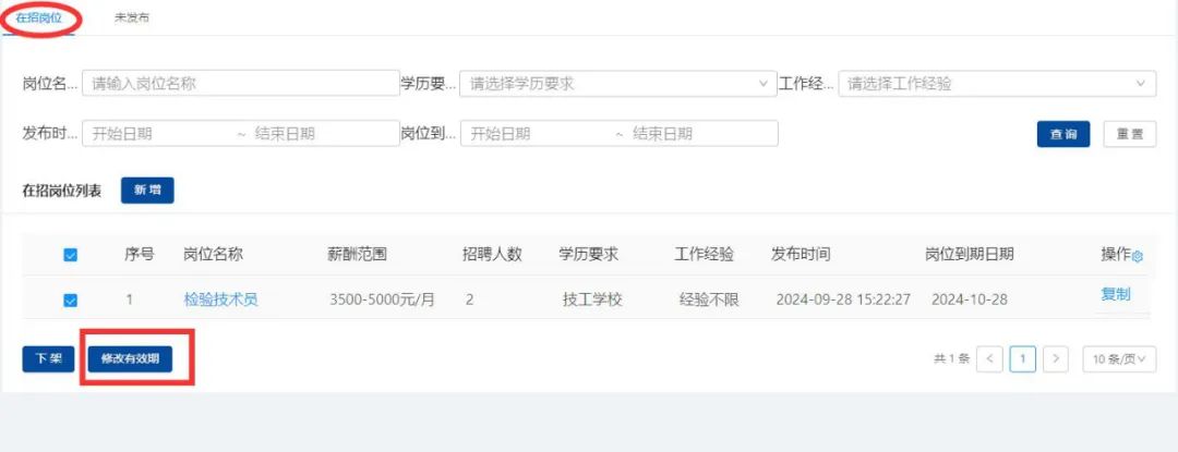 6、修改有效期:在【在招崗位】列表頁,勾選單條或多條職位,點擊【修改有效期】按鈕,彈窗顯示發(fā)布有效期選擇界面,選擇日期后保存,勾選的職位發(fā)布有效期統(tǒng)一更換為選擇的日期。過了發(fā)布有效期后,職位會自動下架。