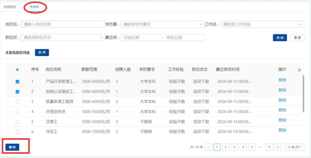 7、刪除職位:只能對未發(fā)布的職位進行該操作。在【未發(fā)布】列表頁,勾選單條或多條職位,點擊【刪除】按鈕,即可刪除職位。