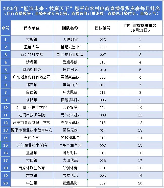 9月11日,2025年“恩平優(yōu)品杯”農村電商線上直播帶貨團隊競賽火熱開賽!本次賽事由恩平市人力資源和社會保障局、恩平市總工會、恩平市資產管理委員會辦公室聯(lián)合主辦,共有20支參賽隊伍同臺競技。在自主直播賽段中,從8人協(xié)作的“王牌戰(zhàn)隊”到單槍匹馬的“獨行俠”,各隊伍紛紛亮出看家本領,以產品講解、福利互動等多樣形式,全力為恩平名優(yōu)產品帶貨引流。
