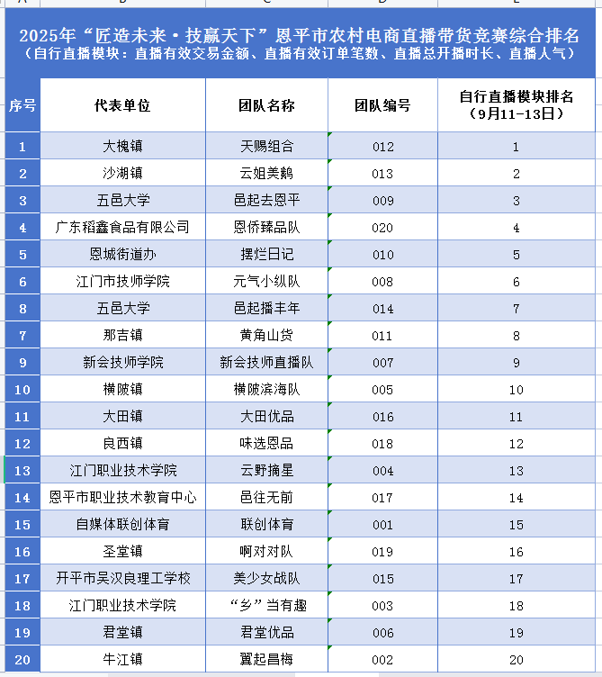 經(jīng)過9月11-13日的比拼,來自恩平大槐鎮(zhèn)的天賜組合憑借亮眼的銷售數(shù)據(jù)與超高直播間熱度繼續(xù)斬獲冠軍,來自沙湖鎮(zhèn)的云姐養(yǎng)鵝隊、來自五邑大學的邑起去恩平隊緊追不舍,分獲第二、三名。