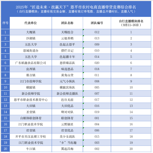 經(jīng)過9月11-16日的比拼,來自恩平大槐鎮(zhèn)的天賜組憑借亮眼的銷售數(shù)據(jù)與超高直播間熱度穩(wěn)居冠軍之席,來自沙湖鎮(zhèn)的云姐養(yǎng)鵝隊(duì)、來自五邑大學(xué)的邑起去恩平隊(duì)緊追不舍,分獲第二、三名。